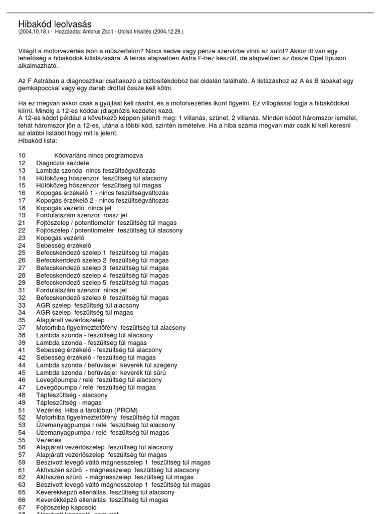 Opel Astra H Hibakódok Jelentése